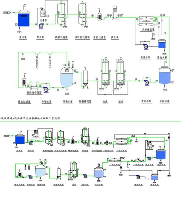 ☆預(yù)處理----一級(jí)反滲透----pH調(diào)節(jié)裝置----中間水箱----二級(jí)反滲透----純水箱----純水泵----紫外線殺菌器----微孔膜過濾器----用水對(duì)象